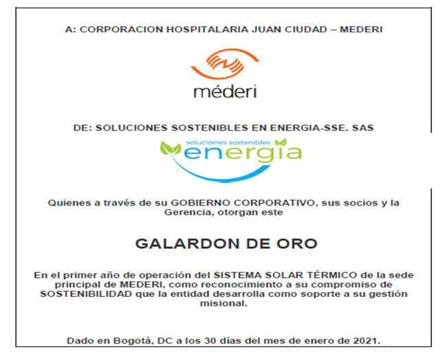 El GALARDON DE ORO lo otorga Soluciones Sostenibles en Energía SSE, empresa que instaló el proyecto solar térmico y a través del cual reconoce el compromiso demostrado durante el primer año de funcionamiento.